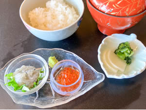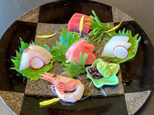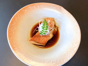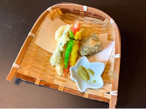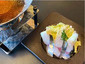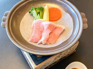 黒豚陶板焼き・桜鯛木の芽鍋、白魚3色揚げ・筍天婦羅、料理長自慢の会席。